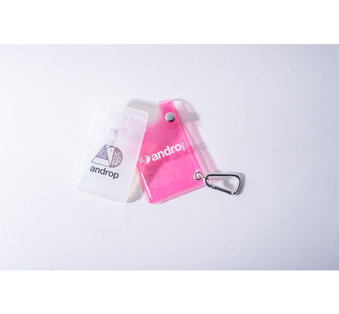 Price:¥2,500 Size: <本体>約 W55×H93×D10㎜ <ケース>約 W68×H100×D15㎜ Material: <本体>ポリエチレン <ケース>PVC ※カラビナ付き 使い切りタイプ Internal capacity:15ml、アルコール濃度55vol% 香り付きのアルコールスプレーです。クリアピンクのケースはICカードが入るサイズ。 <注意事項> ※画像はイメージです。掲載している写真・デザイン・カラー・サイズ・仕様等は変更になる可能性がございます。予めご了承ください。 ※商品ごとにサイズ規格を設けておりますが、商品の素材や加工工程により、多少の個体差が生じる場合がございます。予めご了承ください。 ※何度でもお申し込み頂けますが、一度の決済につき都度送料が発生致しますので予めご了承ください。 ※ご購入後のキャンセル、サイズ変更、また数量の変更はお受けできません。必ず商品、数量をお確かめのうえご購入ください。 ※お申し込み締切後は、いかなる場合も対応できかねますので、ご了承ください。 ※お届けした商品に万が一不備があった場合、商品到達後、7日以内にお問い合わせください。詳しくは「androp official online shop」サイト「よくあるお問い合わせ」ページ内をご覧ください。 ※運送業者による遅延が発生する場合もございます。配達日についてはお約束出来かねますので、予めご了承の上お申し込みいただきますようお願い申し上げます。