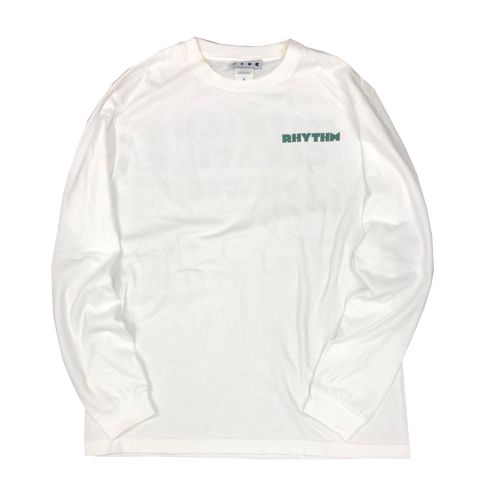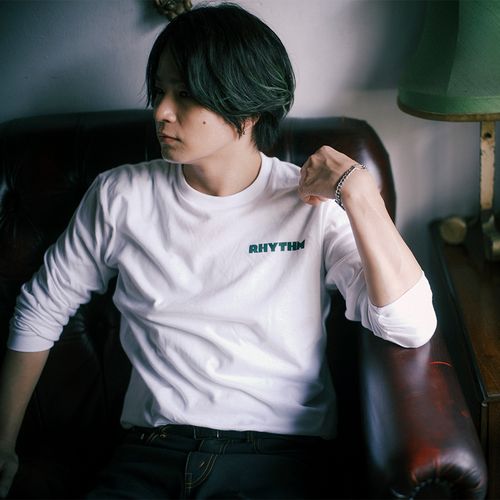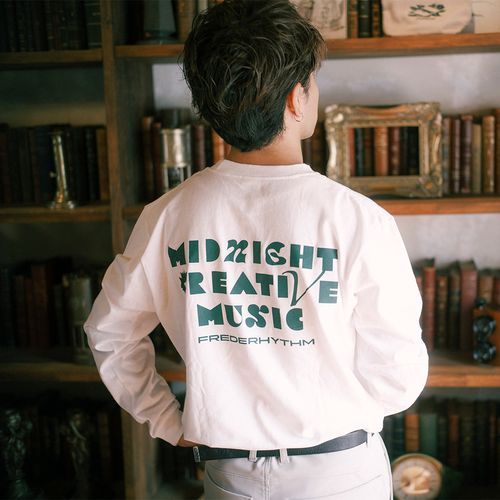 ホワイトのボディーにグリーンで「MIDNIGHT CREATIVE MUSIC」の文字がプリントされた、康司デザインTシャツ。