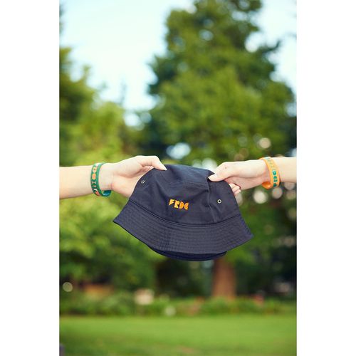 ネーブルオレンジの「FRDC」刺繍ロゴが特徴のバケットハット