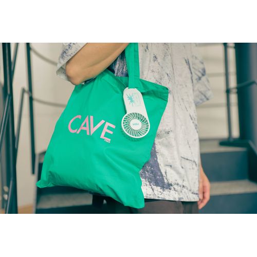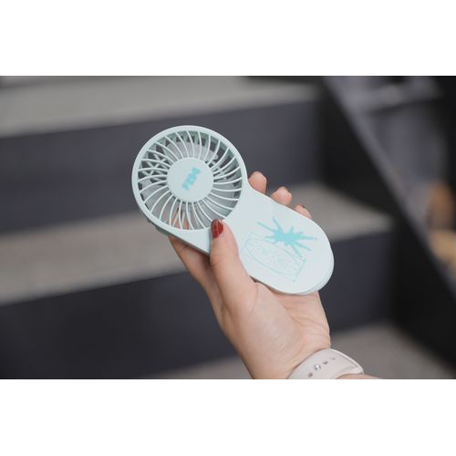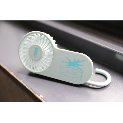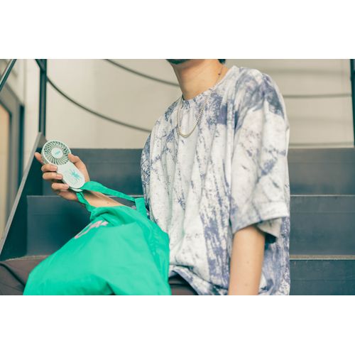 バッグに取り付けたり、スタンドファンとしても、マルチに使用できるCYANカラーのハンディファン。