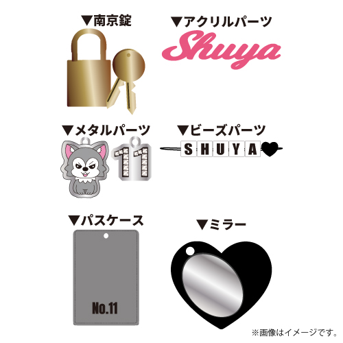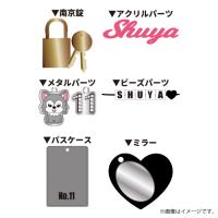 〈アクリルパーツ〉アクリル、〈ミラー〉ガラス、合皮、〈パスケース〉合皮、〈メタルパーツ〉亜鉛合金、ガラス、アクリル、〈キーカバー〉合皮、ABS、〈南京錠〉亜鉛合金