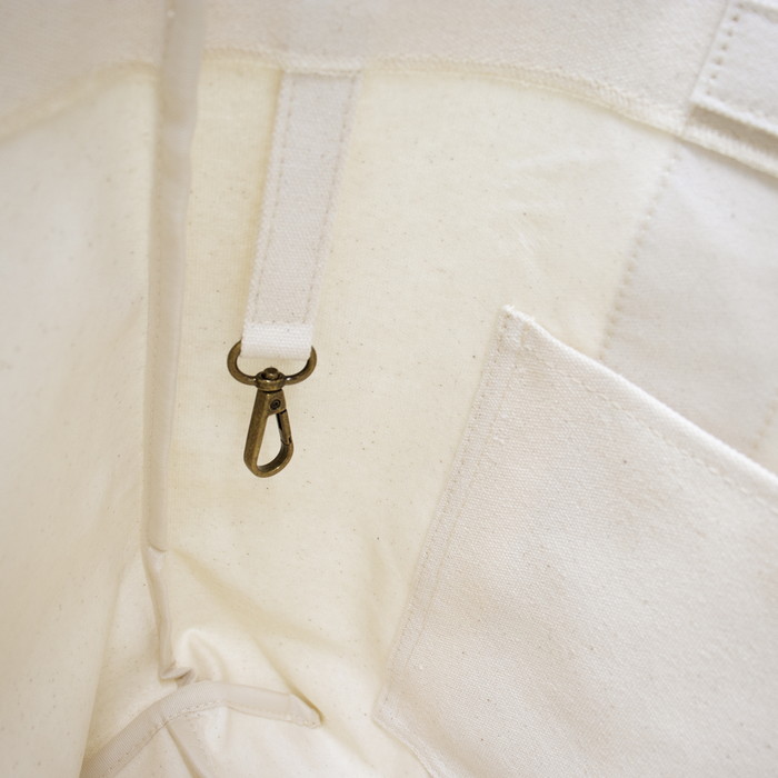 厚みのある帆布を使用し自立するほどの安定感と型崩れがしにくいトートバッグです。 内側にはオープンポケットを2つ配置し、 スマホやパスケースなど、迷子になりがちな小物をスッキリ収納できます。 またバッグの中で見失いやすい鍵やポーチを繋いでおけるカラビナも備えました。 【サイズ】 H約32 x W約50 x 底マチ約14 (cm) ※色やサイズ等、実際の商品と若干異なる場合がございます。予めご了承下さい。